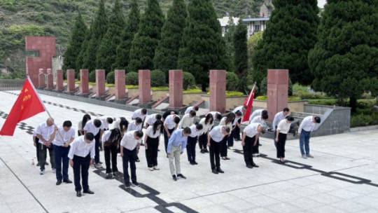 飛奪瀘定橋紀念館紀念碑前,全體黨員干部整齊列隊,向英勇獻身的烈士默哀并鞠躬,向人民英雄敬獻花籃。蜀道裝備深冷科技公司黨支部書記陳毅,黨支部委員、執行董事陸凌上前整理花籃緞帶,表達對人民英烈的無限哀思和崇高敬意。在陳毅同志的領誓下,全體黨員面對鮮紅的黨旗高舉右手,莊嚴重溫入黨誓詞,進一步增強責任感和使命感。