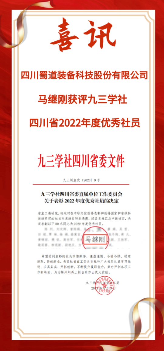近日,九三學社四川省委直屬單位工作委員會對2022年度在本職崗位獲得表彰及獲得國家和省級科技進步獎的社員同志進行特別表彰。蜀道裝備公司副總經理、董事會秘書馬繼剛獲評2022年度“優秀社員”稱號。