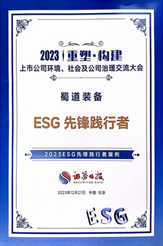 12月27日,由《證券日?qǐng)?bào)》主辦的“2023環(huán)境、社會(huì)及公司治理發(fā)展交流大會(huì)”在北京舉行。蜀道裝備公司“持續(xù)完善公司治理,積極推動(dòng)綠色低碳轉(zhuǎn)型發(fā)展”案例榮獲“ESG先鋒踐行者”獎(jiǎng)。