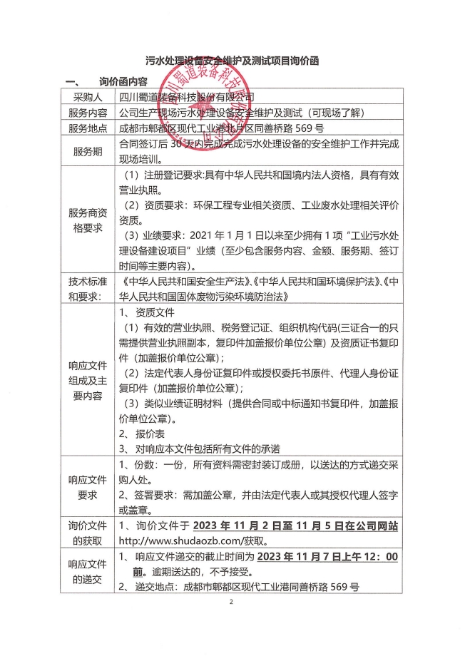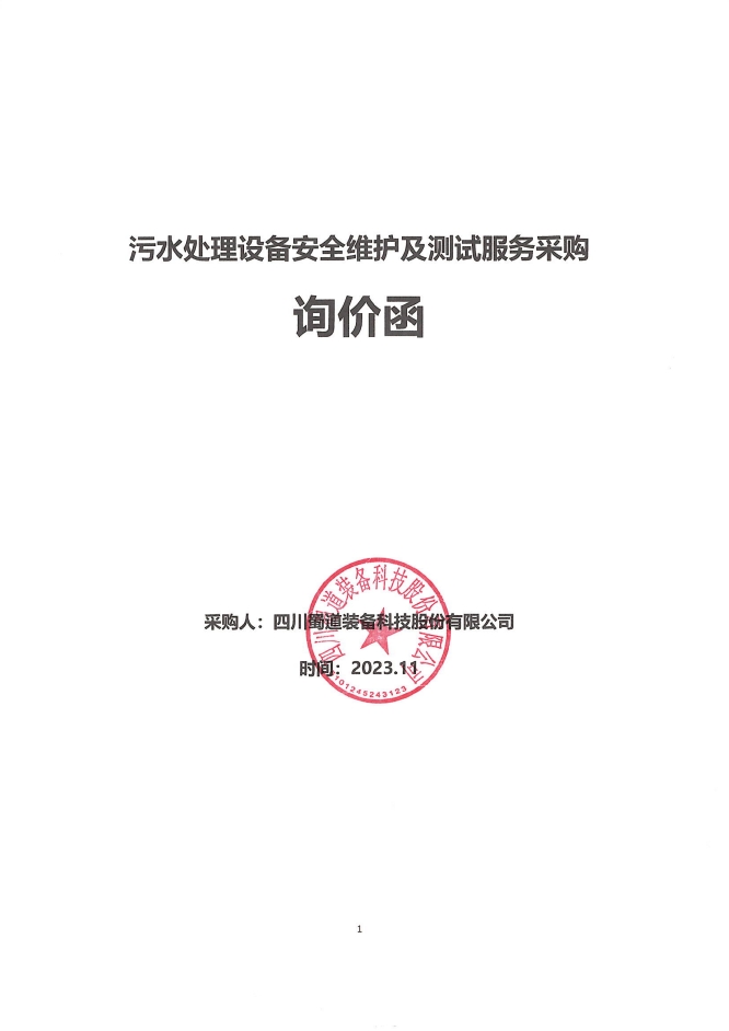 四川蜀道裝備科技股份有限公司污水處理設(shè)備安全維護(hù)及測(cè)試服務(wù)詢價(jià)函