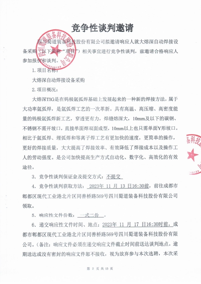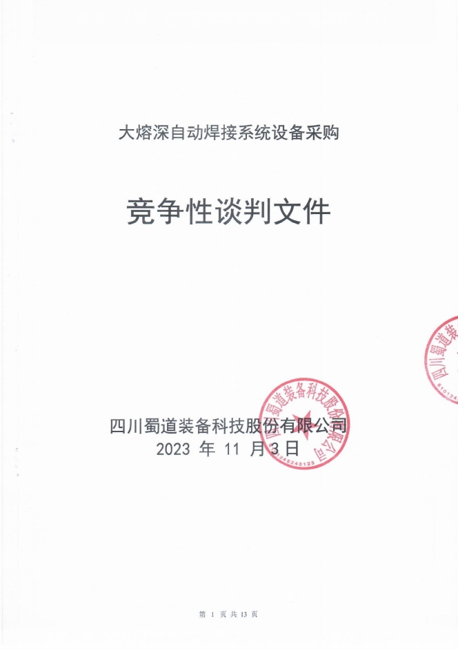 四川蜀道裝備科技股份有限公司大熔深自動(dòng)焊接系統(tǒng)競爭性談判文件