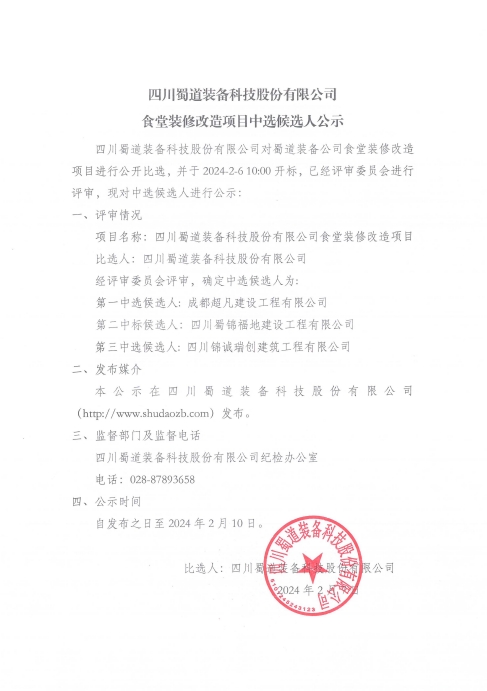 四川蜀道裝備科技股份有限公司食堂裝修改造項目中選候選人公示